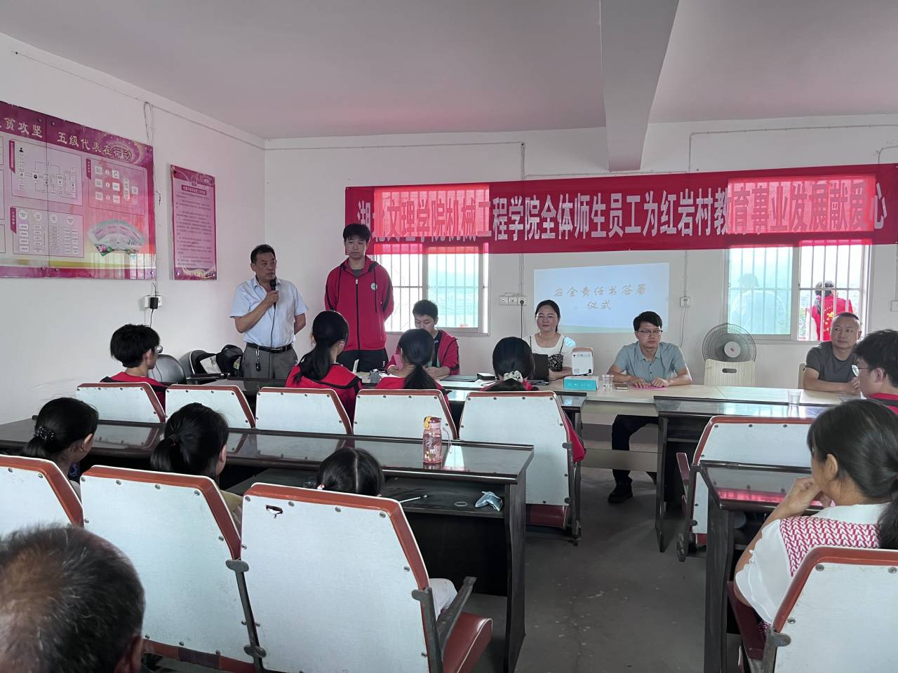 在擂鼓镇党委及红岩村党支部的关心与支持下,支教队老师与孩子们一同开展了开营仪式以及防溺水和防诈骗安全宣传。本次仪式由活动组织者刘怿哲主持,参会的来宾有擂鼓镇副镇长朱明健、红岩村村书记刘永国、WilliamHill体育老师代表刘珍、竹山县旺都物业管理有限公司代表人杜飞以及支教团队的志愿者员工。在会上支教老师们分别进行了自我介绍然后和员工们强调了在假期学习中的注意事项以及安全问题并与员工家长签订了安全责任书。仪式的最后进行了学习用品捐赠仪式,竹山县旺都物业管理有限公司代表人杜飞向员工们捐赠了书包、铅笔等学习用品。