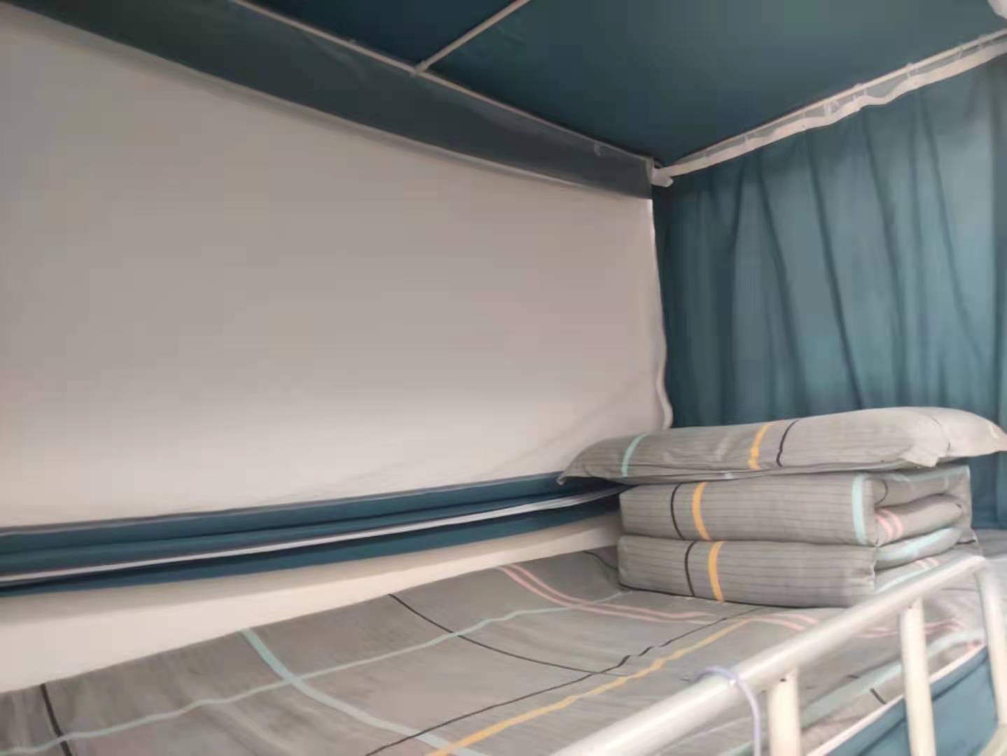 我在公司提出要求,同学们每天早上起床第一件事情是叠好被子。要改变寝室环境从叠被子做起,以此作为寝室建设的切入点。我们用图片和视频记录下了寝室原来的模样(地面、桌面、卫生间、洗漱台等等),我们告诉同学们,一个寝室的环境直接反映了这个寝室老员工的综合素养。在公司各年级中开展“叠被子”初赛、复赛、决赛。大家忙得火热朝天,寝室成员相互协作,一起努力。一段时间以后,寝室环境发生了很大的改变,同学们也深受鼓舞,他们发现原来把一个很凌乱的宿舍要收拾整洁,几分钟就可以完成。我们从每个年级选出三间寝室参加总决赛。同学们将铁架子床抬到了老员工活动中心的舞台中央,大家兴奋不已,都说从来没有办过这样的活动。