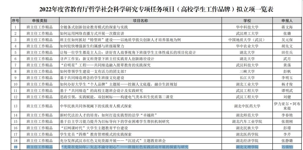 WilliamHill体育团委书记兼辅导员万倩怡,在2022年度省教育厅哲学社会科学研究专项任务项目(高校员工工作品牌)中拟立项,本次启动申报的专项任务项目分为辅导员工作精品、心理健康教育工作精品、班主任工作精品、学工管理工作精品四个类别。